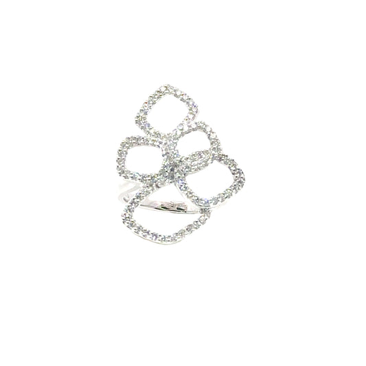 Un anillo con racimo de diamantes es un tipo de anillo que presenta varios diamantes más pequeños colocados muy juntos para crear la apariencia de un diamante más grande y prominente. Estos diamantes más pequeños suelen estar dispuestos en un racimo o grupo, a menudo en una forma o diseño específico, como una flor o un patrón geométrico.