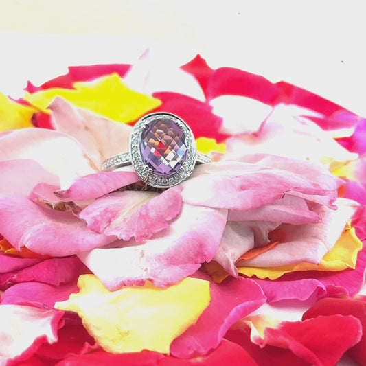 Anillo de cóctel con halo de diamantes naturales y amatista natural en oro blanco de 14 quilates.