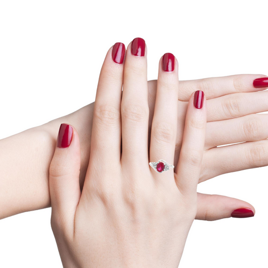 Anillo de compromiso con piedra preciosa de rubí ovalada y roseta